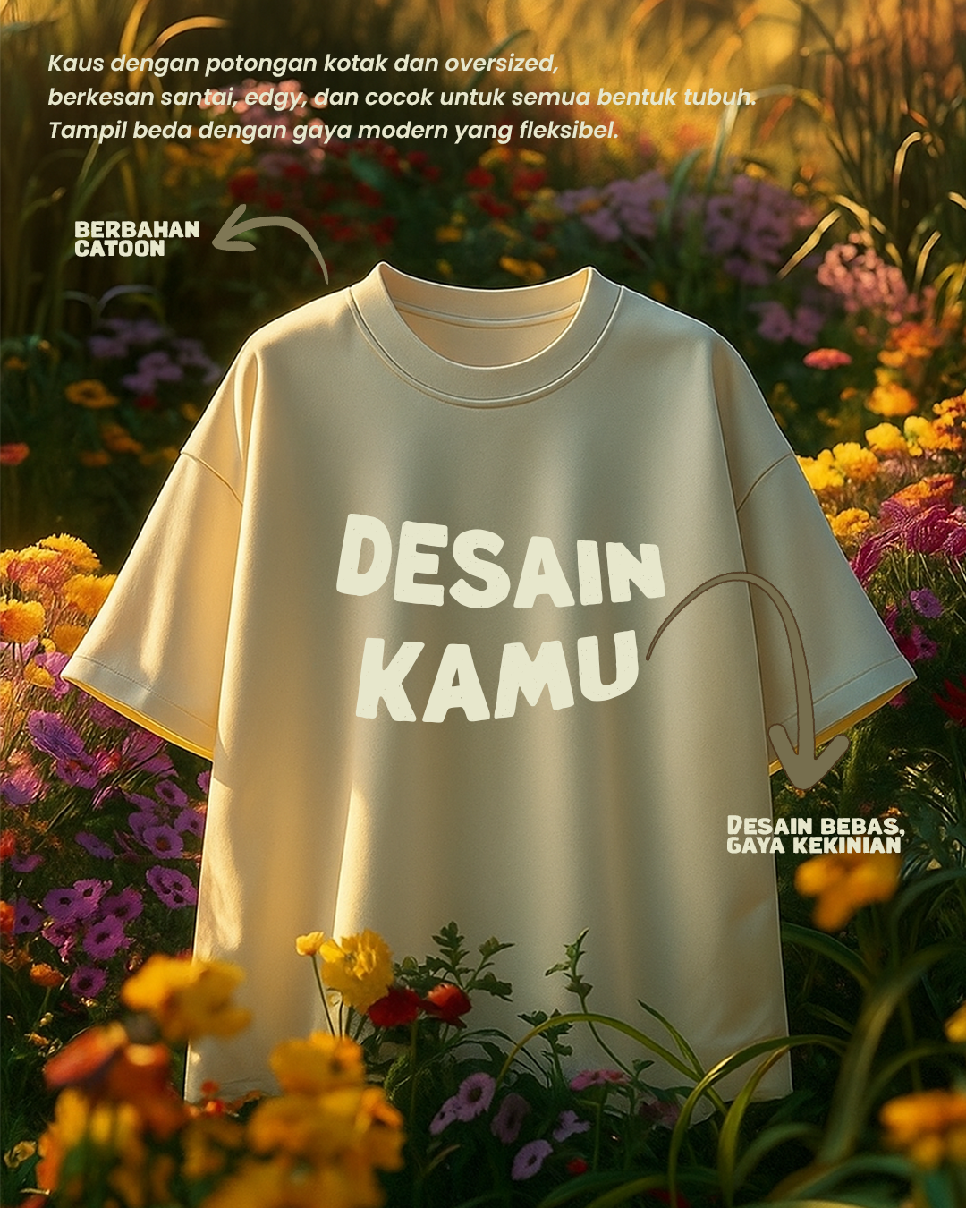 Kaos dengan potongan kotak dan oversized—vibe santai, edgy, dan fleksibel. “Desain Kamu” dengan pesan “Desain Bebas, Gaya Kekinian”. (Bahan/ukuran detail konfirmasi via chat.)